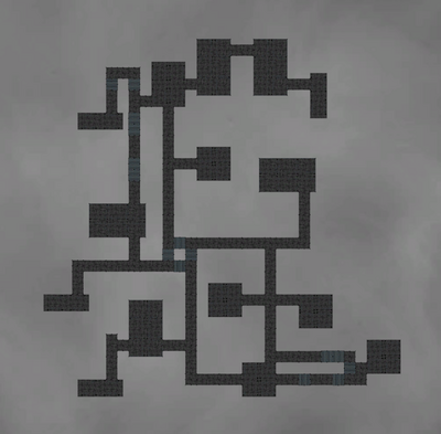 The ground floor of the basement, a variety of rooms border a long hallway eventually leading to a spiral staircase. | The ground floor of the basement, a variety of rooms border a long hallway eventually leading to a spiral staircase. | ||