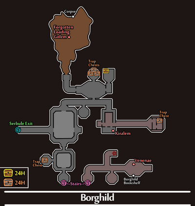 Borghild offers adventurers a challenge, as the years of different cultures inhabiting the dungeon has led to a variety of inhabitants. Ancient dwarven golems guard some areas, while the crypts have become filled with myriad undead. The slow-moving Face of Death is a common sight, capable of instantly killing any enemy on contact. Unprepared explorers will find Greedy Ghosts impossible to defeat without a stun, and a nest of highly poisonous Injector Bugs are also nested within.
