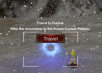 Gazluk is a frozen tundra region beyond the Kur Mountains. The area is mostly known for the once public Gazluk City and the tragic incident of Prestonbule. New Prestonbule Cave is the only friendly zone. Outside of this there are several other towns, but these towns are inhabited by either Orcs, or Incorporeal Creatures. The Gazluk underground is crisscrossed by a maze of interconnected caverns. Underneath Gazluk City, the massive stronghold of Gazluk Keep can be found.