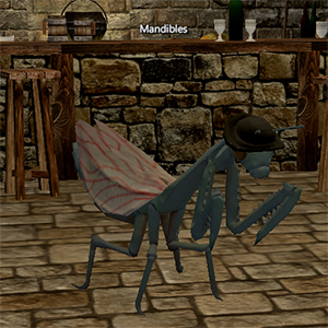 Mandibles is a mantis cook in the Kitchen within the Red Wing Casino. She also teaches some cooking recipes as well as a cheesemaking recipe or two.