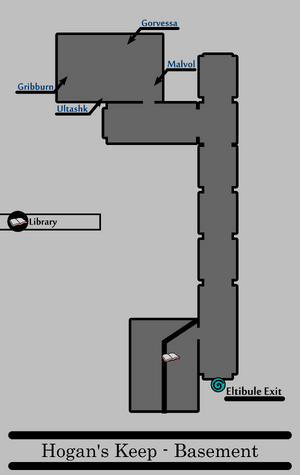 The basement of Hogan's Keep, located beneath Hogan's Keep, is home to a band of goblins who escaped slavery (note that in goblins customs, "slavery" means that they serve a war contract). Malvol is the leader of the band, he is an expert in Sword techniques. Gorvessa is his "wife" of sorts. She admits to serve as his "harem", but with enough favor she will reveal that she is a shield-basher at heart. The two other goblins, Ultashk and Gribburn, appear to be placeholders (as of the alpha).