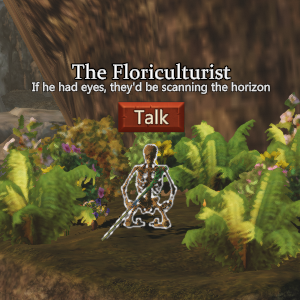 Meditating on a small flying rock in Vidaria. To talk to The Floriculturist you need level 50 in Corpse Talking. Each conversation can be initiatiated with one Fetish Bag.