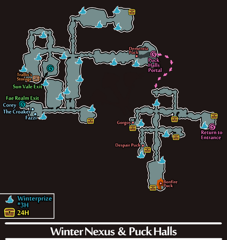 The ProjectGorgon:Winter Nexus is an entrance to a plane of existence made entirely of cave-like Nexuses. The shape of this realm changes over time, but the section accessed through ProjectGorgon:Sun Vale is stable, forming a cavernous corridor between ProjectGorgon:Alharth and the ProjectGorgon:Fae Realm. This particular Nexus is being used by the ProjectGorgon:Winter Court to search for and capture the ProjectGorgon:Summer Court Fae based in ProjectGorgon:Sun Vale, as well as an entry vector for an invasion. A group of Summer and ProjectGorgon:Spring Court Fae are hiding out in the dungeon.